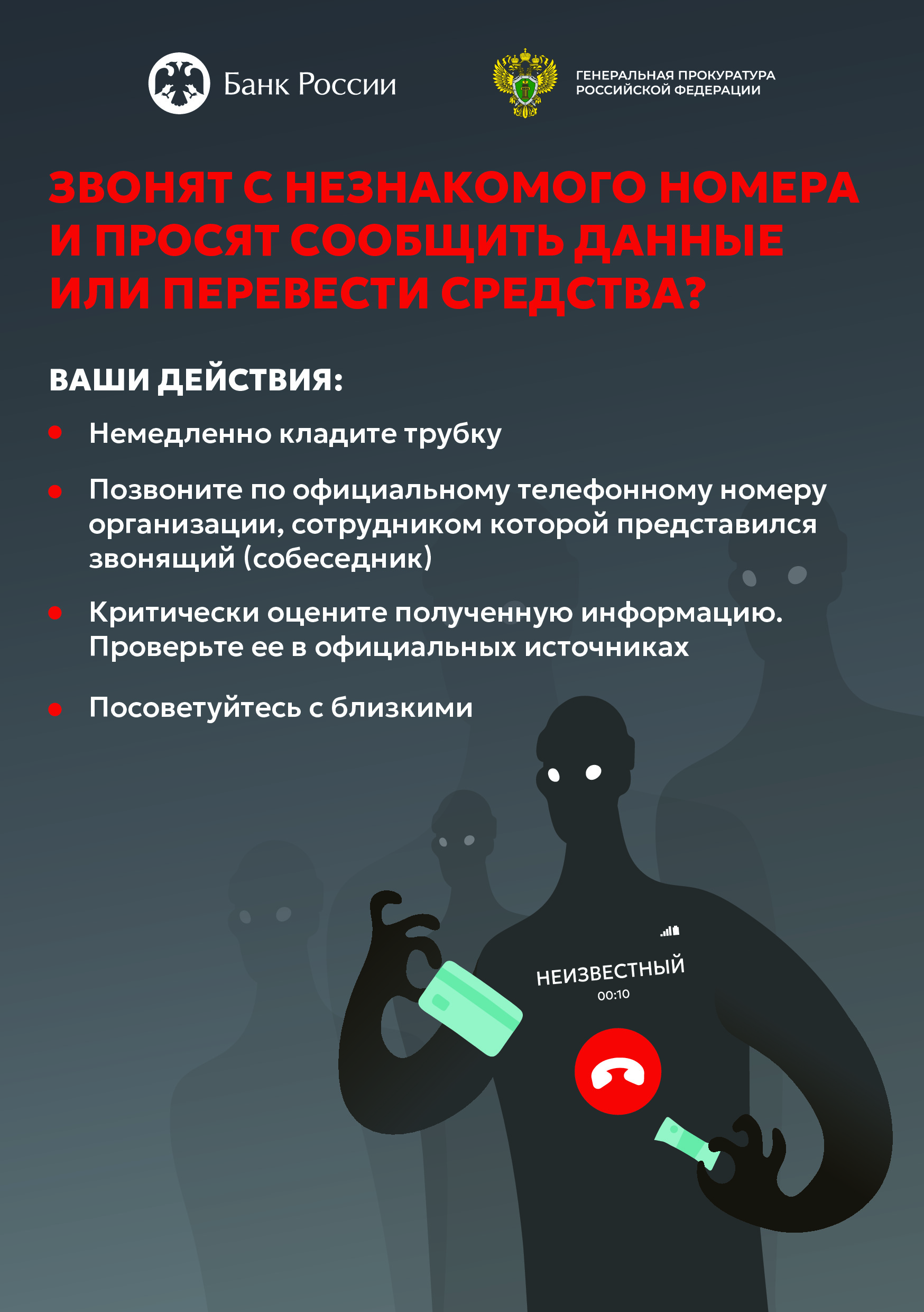 МВД России, Минцифры России, Генеральная прокуратура Российской Федерации, Банк России – в целях повышения уровня информированности населения о действиях лиц, вводящих в заблуждение в целях хищения денежных средств, обращаются к гражданам с простыми и понятными рекомендациями!